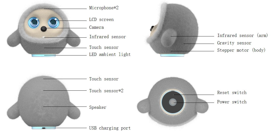 | Capteur tactile | Des modules tactiles distribués (tête, dos, abdomen) sont utilisés pour détecter les caresses et les tapotements (tels que "toucher la tête" et "chatouiller"). |